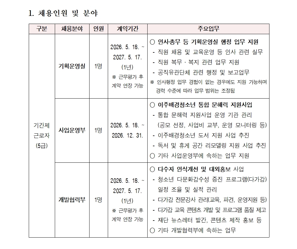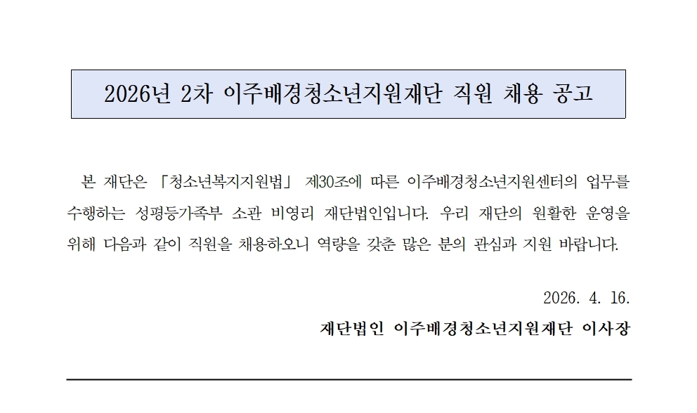2026-2차 이주배경청소년지원재단 직원(기획운영실/사업운영부/개발협력부) 채용공고 (~4/26)